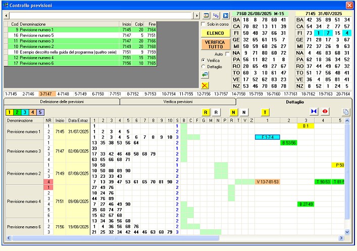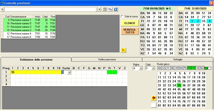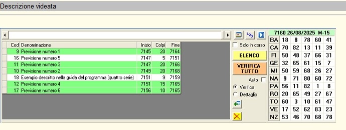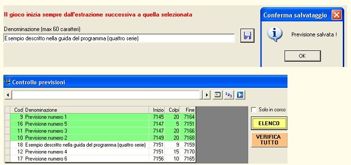 Nella tabella In alto a sinistra è presente l’elenco delle previsioni memorizzate con evidenziate in verde quelle che sono in corso di validità rispetto all’estrazione selezionata.  Se è selezionato il check Solo in corso verranno elencate solo le previsioni che presentano un periodo di verifica compatibile con l’estrazione selezionata.