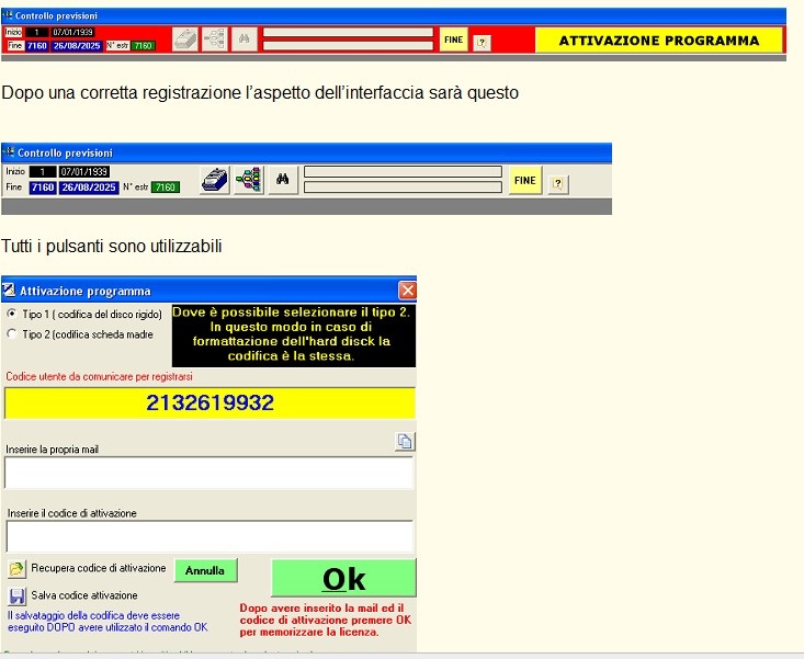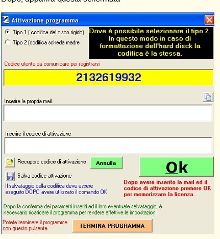 Dopo avere comunicato il codice utente e la vostra mail riceverete il codice di attivazione per far funzionare il software.